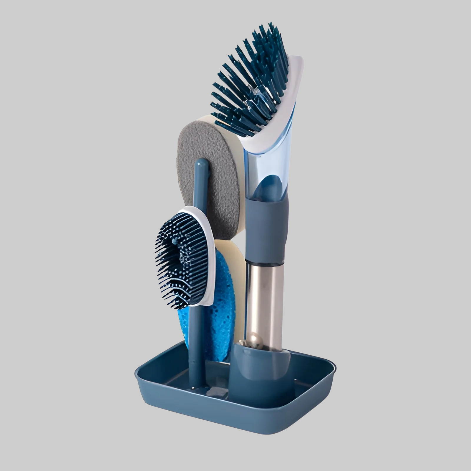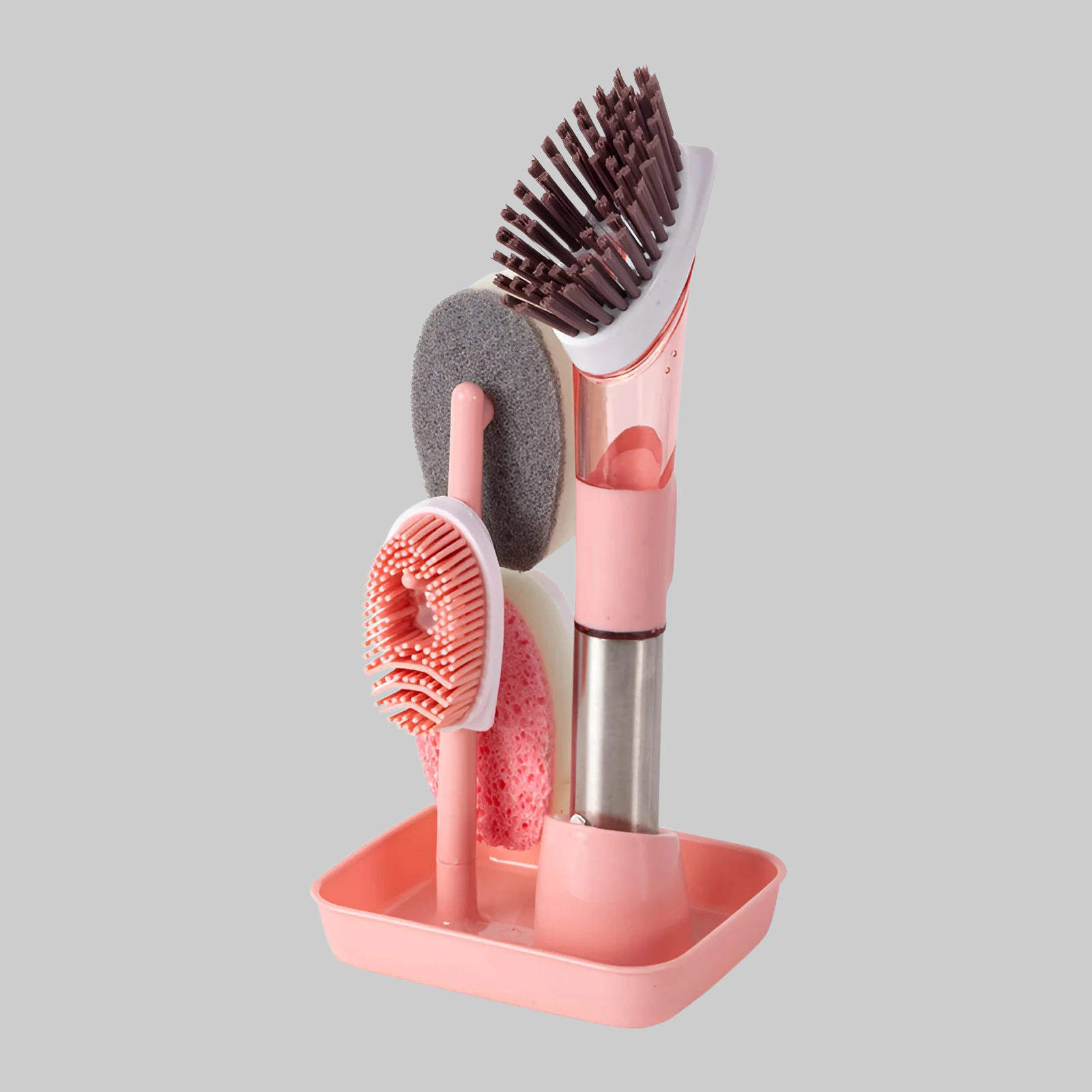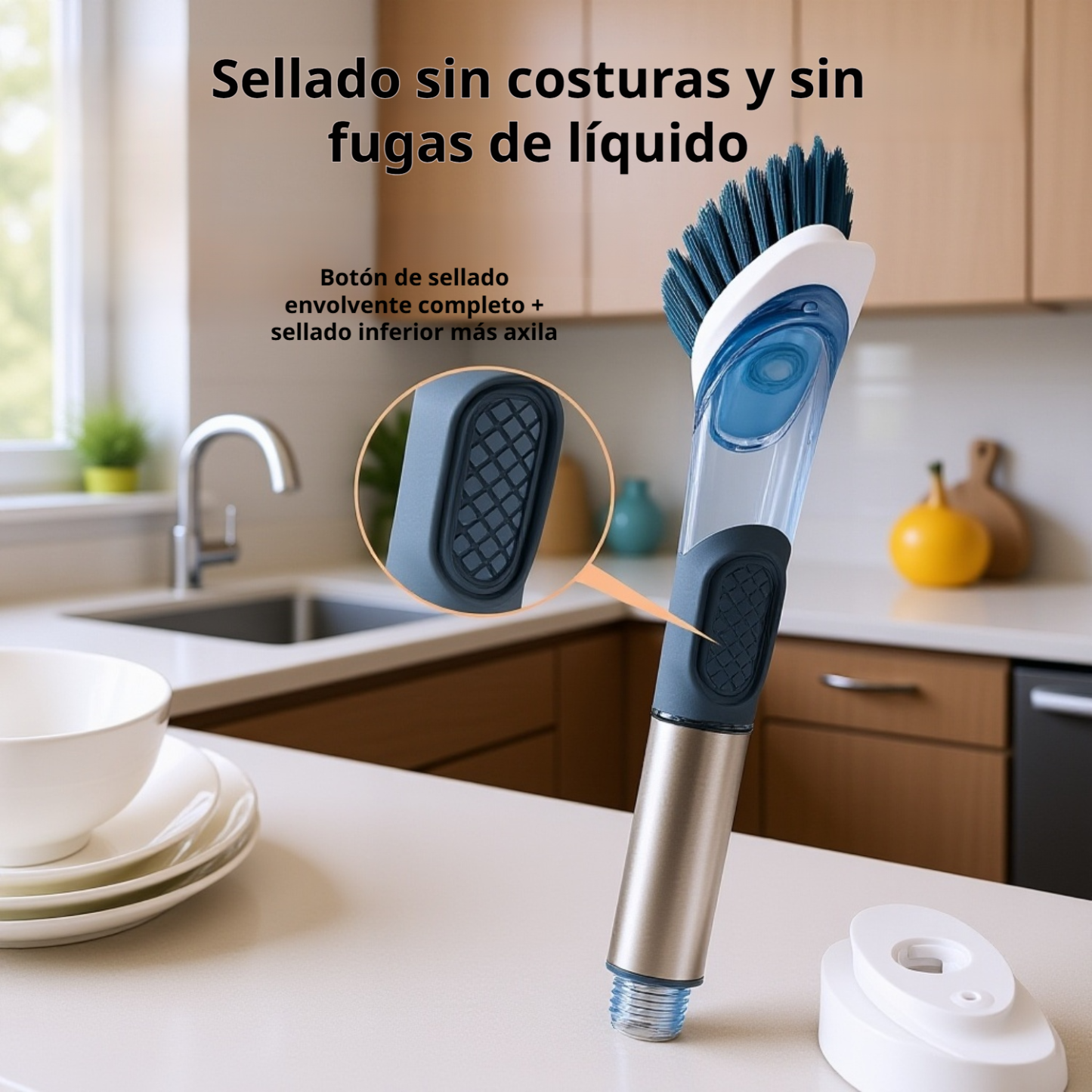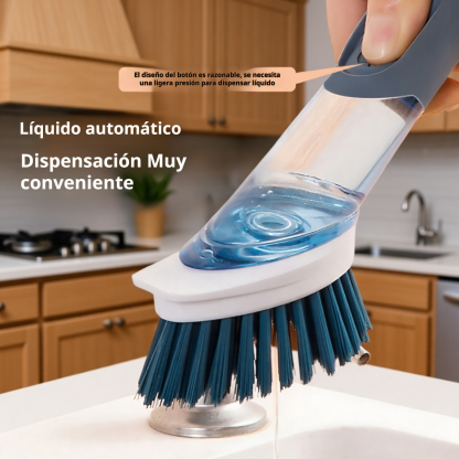 Cepillo de limpieza para ollas 4 en 1 con mango largo y dispensador automático de líquido