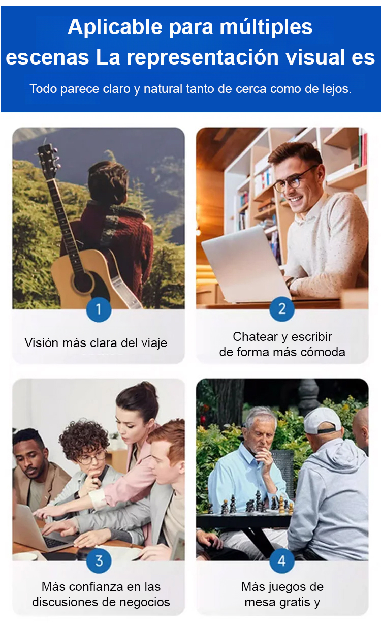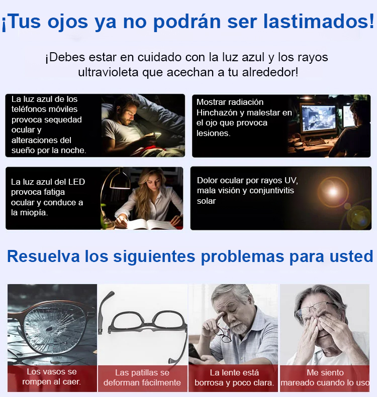 ¡Sin examen de la vista! Las gafas se ajustan automáticamente de 100° a 1000° para adaptarse a tus necesidades visuales, proporcionándote una visión nítida tanto de cerca como de lejos. Prueba gratuita de 14 días; si no quedas satisfecho, te devolvemos el dinero.