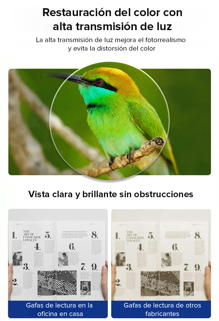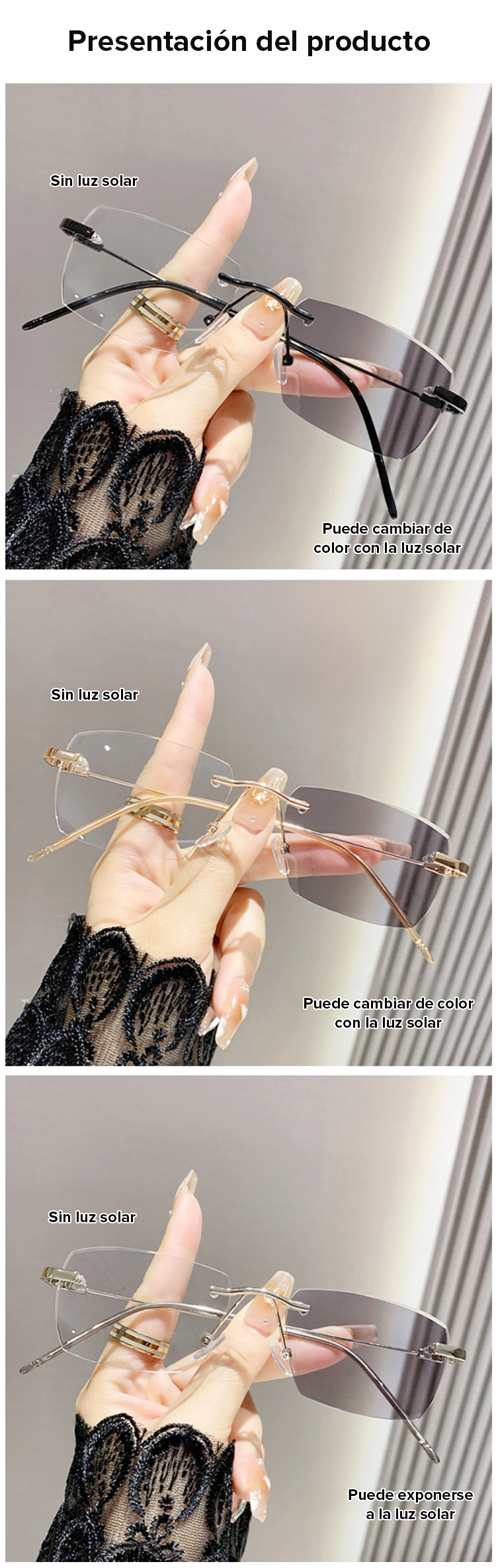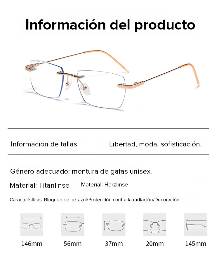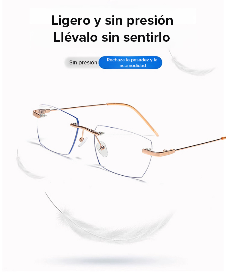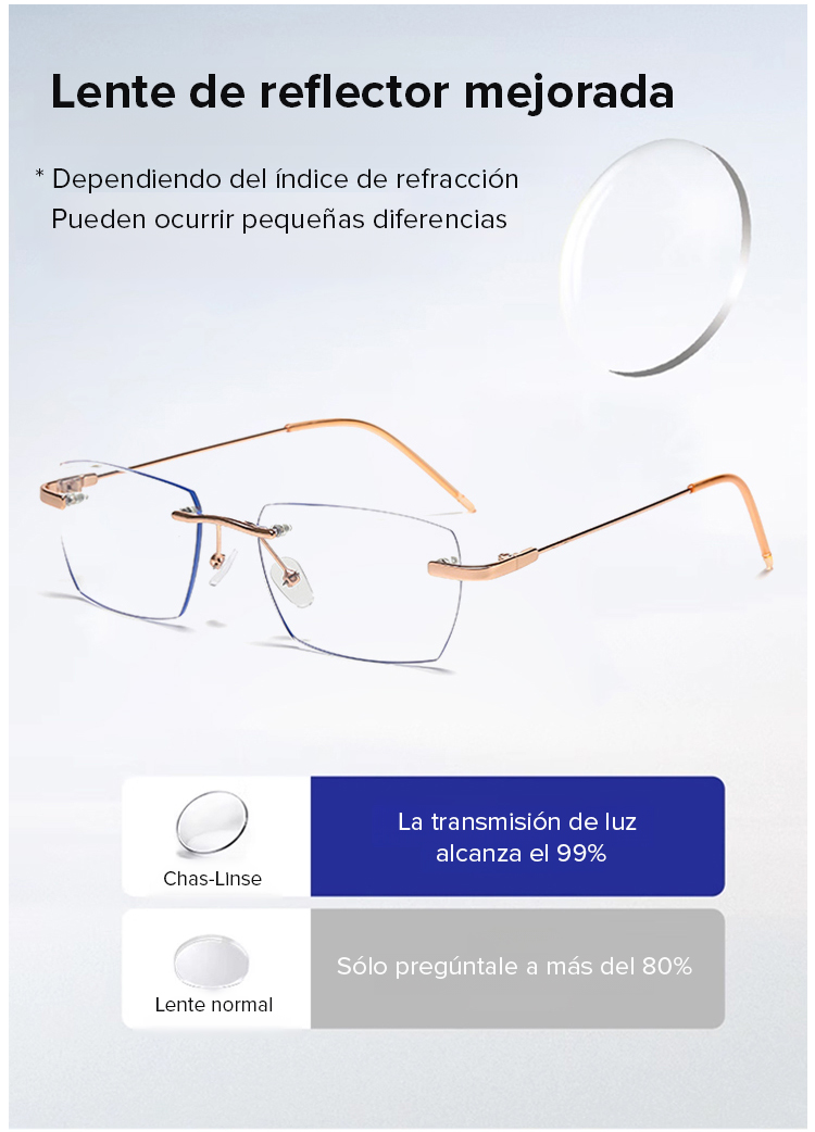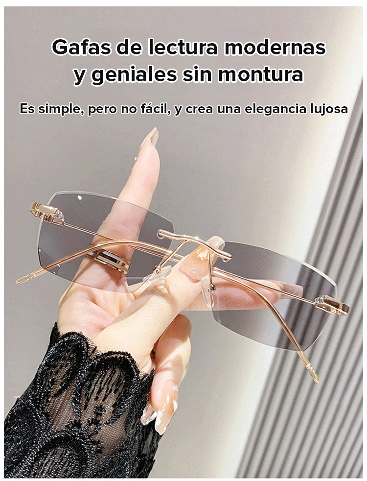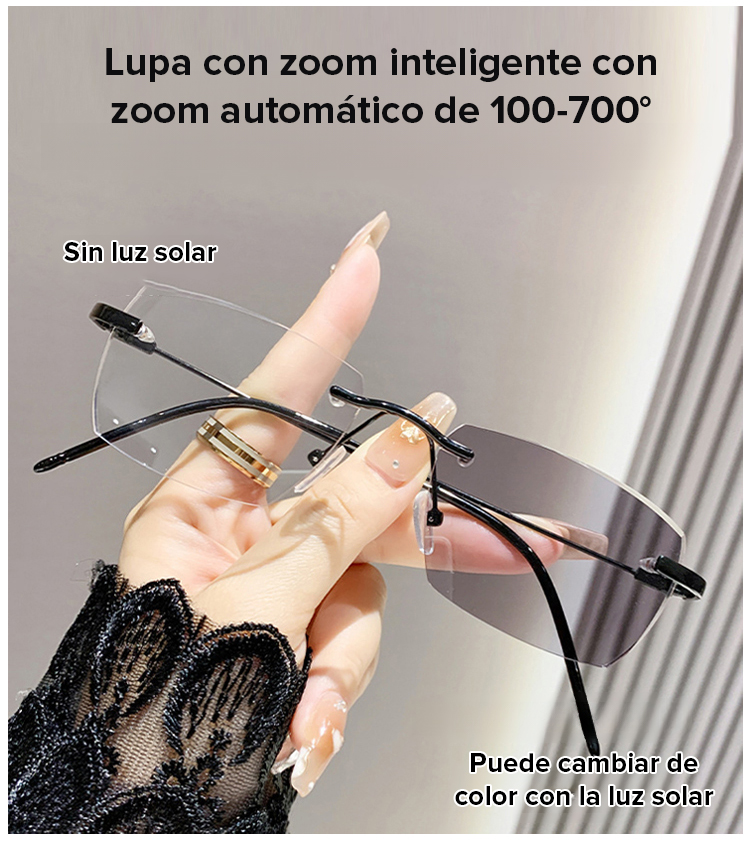 Gafas de lectura sin marco con zoom automático de 100 a 700 grados y propiedades fotocromáticas.